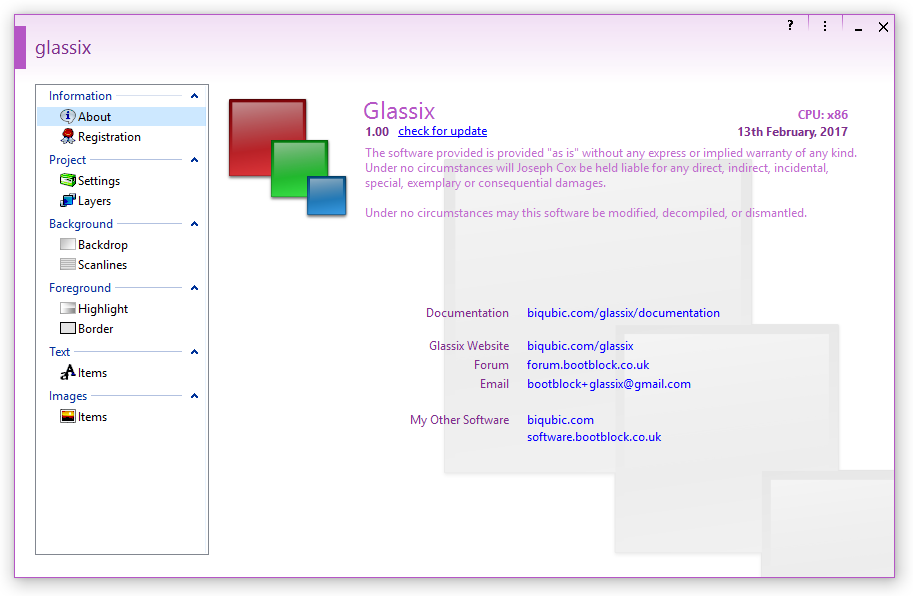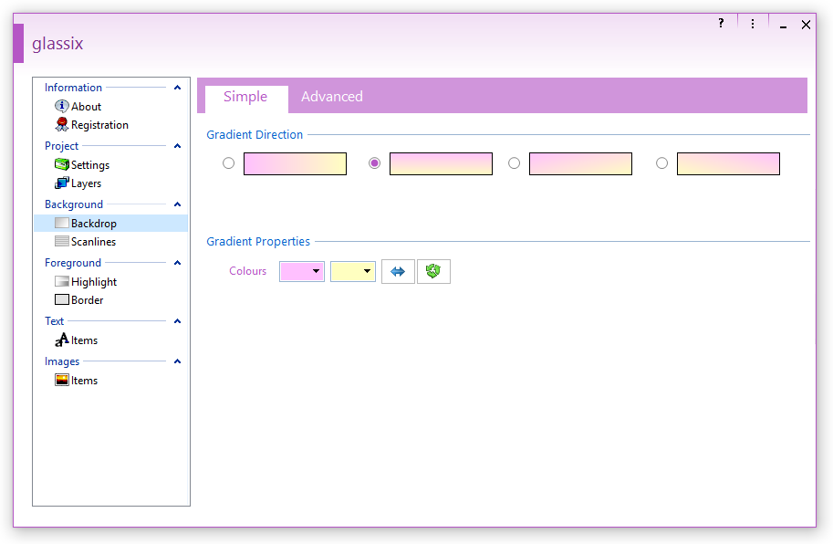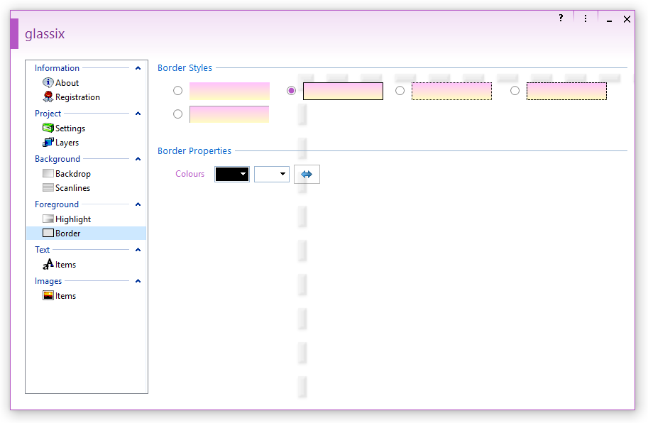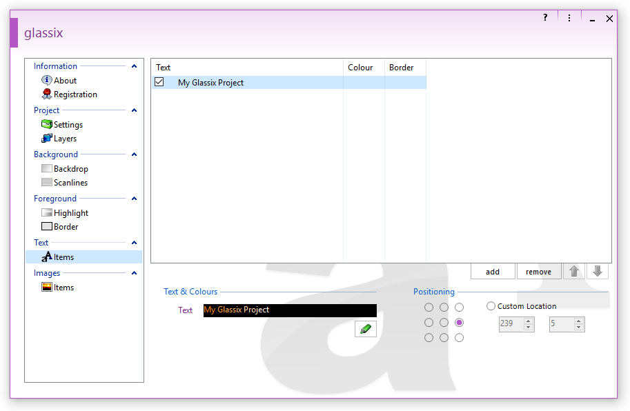 Glassix uses a pixel font for text as it provides a very clean look. Each character within text can have its colour and outline colour changed using the Text Formatter.