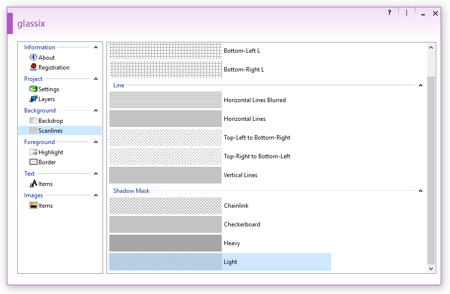 Scanlines are a unique feature in that you can specify a grid-pattern to use to add "texture" to a graphic.