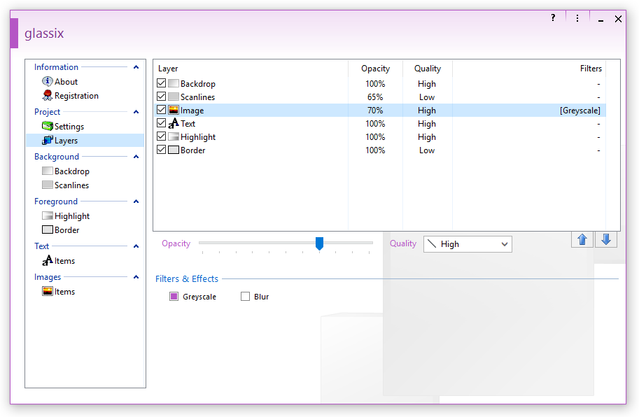 Each graphical element type utilises its own layer so effects can be applied directly to each layer without interference with other elements.
