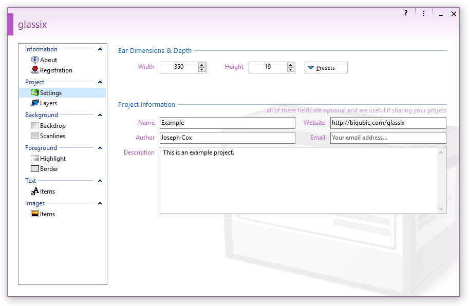 The Settings section is used for setting the basic project settings and any additional informational settings should you want to redistribute any created projects.