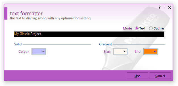 Text can be formatted using the Text Formatter which allows the easy creation of colour gradients.
