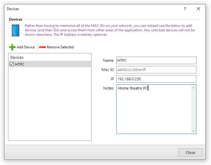 The Devices list can be thought of as an address book you can easily refer to when specifying a MAC ID or IP address within other parts of Network Trigger, thus removing the need to remember individual IDs or IPs.