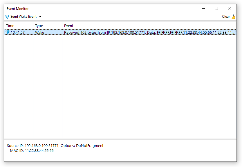 The Event Monitor allows you to see the events that Network Trigger can detect on the network; this can help with investigating whether the application you're sending wakes with is working as expected.