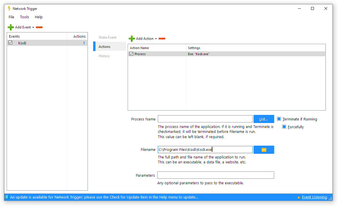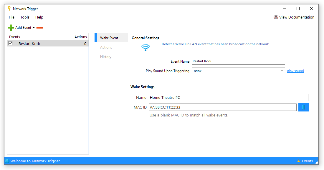 The Wake Event listens for "magic" packets on the network and, once matched, will run a series of actions. This allows you to control a PC using any industry standard wake-on-LAN application.