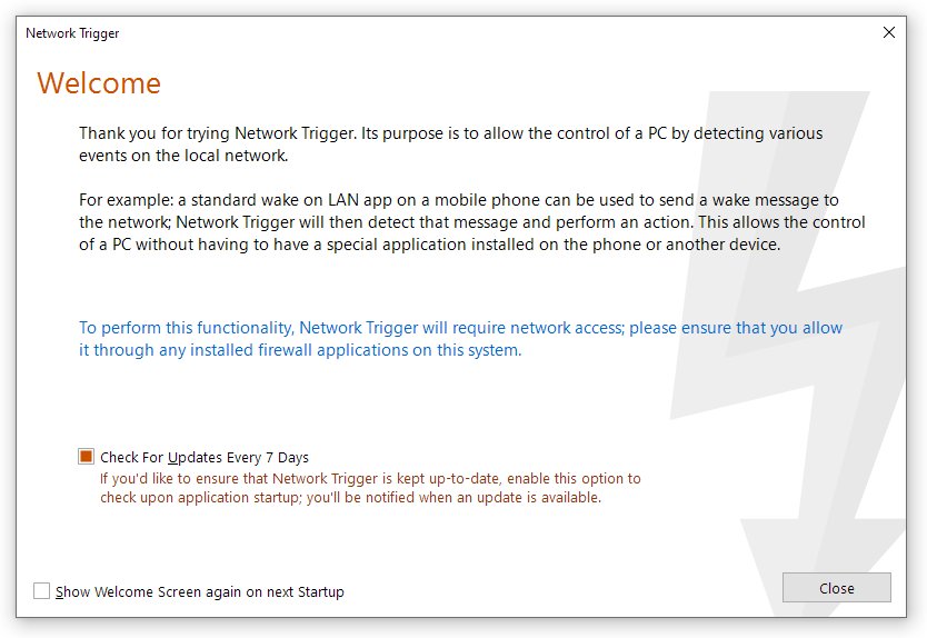 The Network Trigger screen that greets you on start-up explaining its purpose and whether you'd like it to automatically check for updates.
